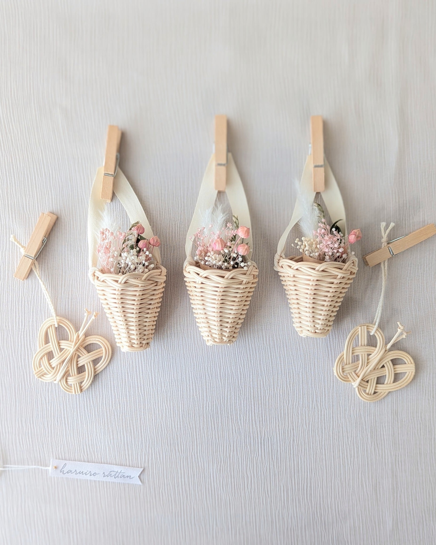 ラタンもお花も自然素材の物を使用しています。どちらも高温多湿や直射日光を避けてご使用ください。